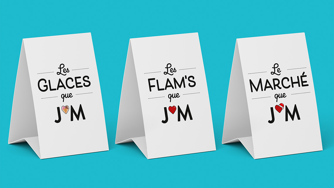 Conception d'un logo décliné pour 3 activités de food truck / restauration ambulante. Ma démarche consiste à l'intégration d'un jeu de mots basé sur le nom de l'entreprise "JM" et le langage abrégé "J'M" de manière stylisée et moderne.