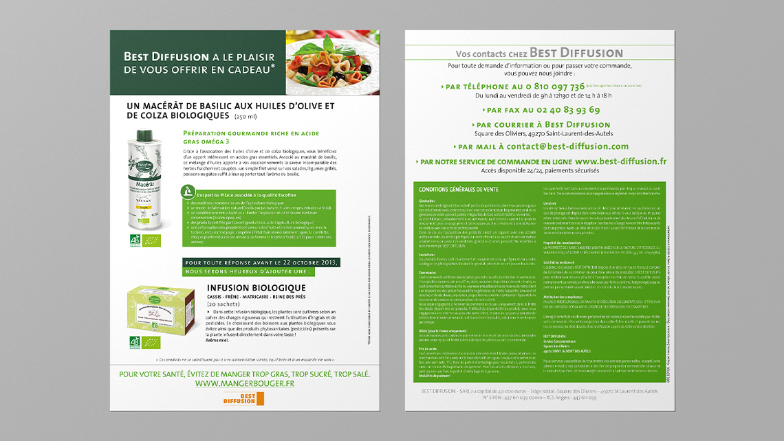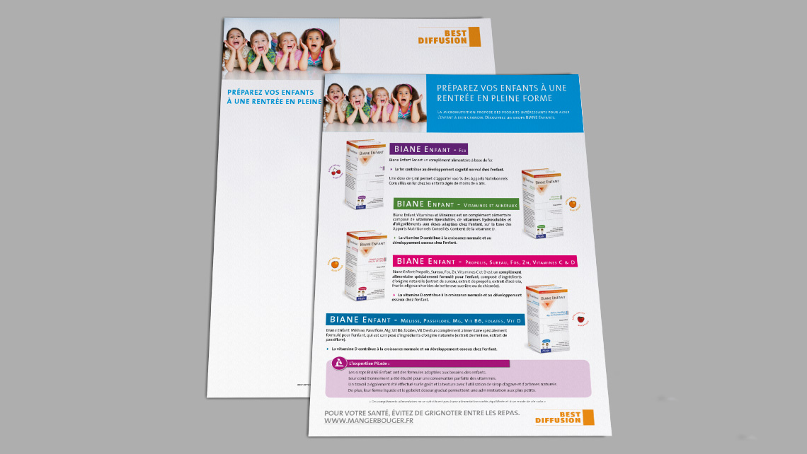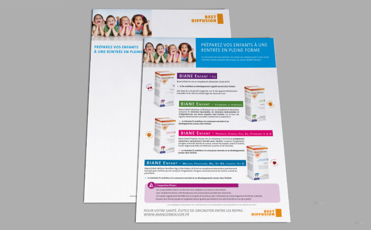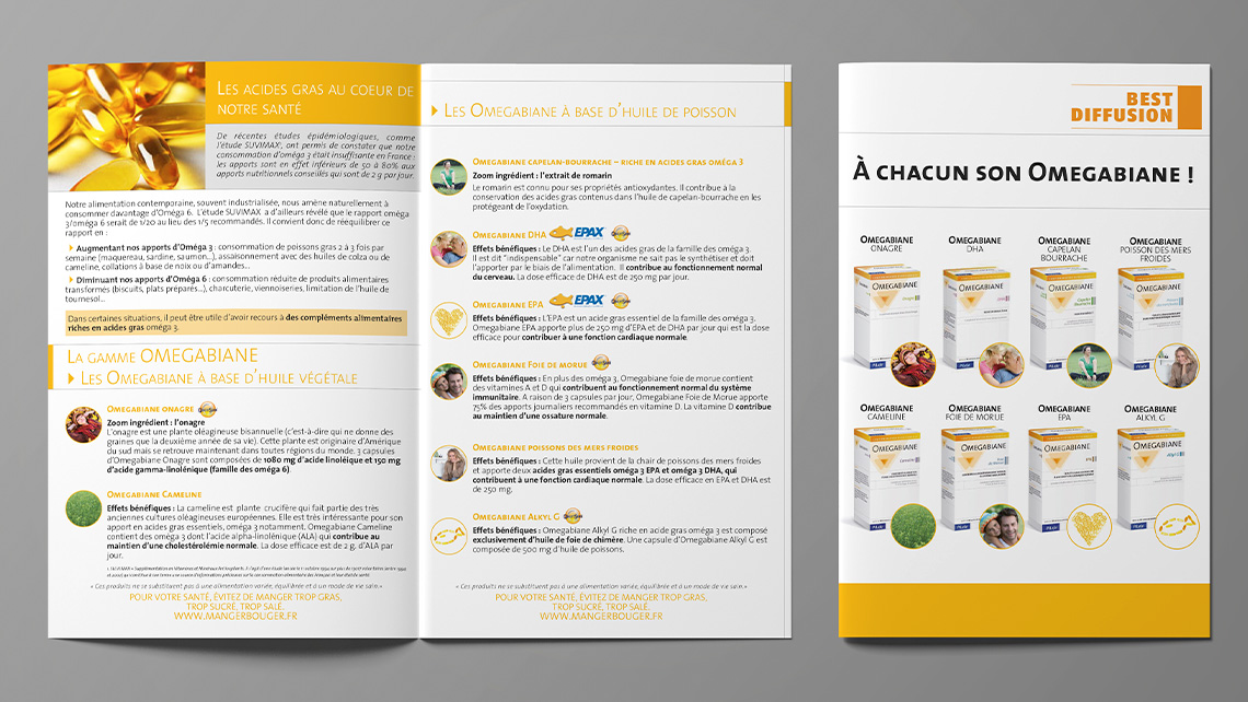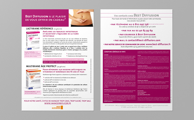 Création et mise en page de supports marketing direct, mettant en avant l'identité de la marque et l'efficacité de ses produits et compléments. Les formats sont soigneusement sélectionnés pour maximiser l'impact de chaque support.